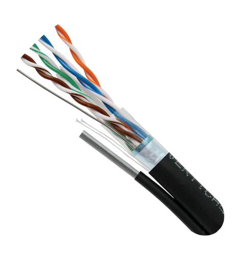 Category 6 Outdoor Rated cable is perfect for high bandwidth aerial installations that require Shielding. UV rays present in sunlight can tear down PVC material and create gaps in the outer jacket, which introduces moisture to the center conductors. To combat this, the jacket is made with LLDPE (Linear low density polyethylene) material, which is much tougher than PVC based materials. Excessive pulling tension often results in warped or broken conductors. To eliminate this, the cable comes with an extra strength Messenger wire that withstands the excessive pulling tension, making this cable suitable for pole-to-pole installations. Made of solid copper conductors to meet and exceed ANSI/TIA cabling standards.